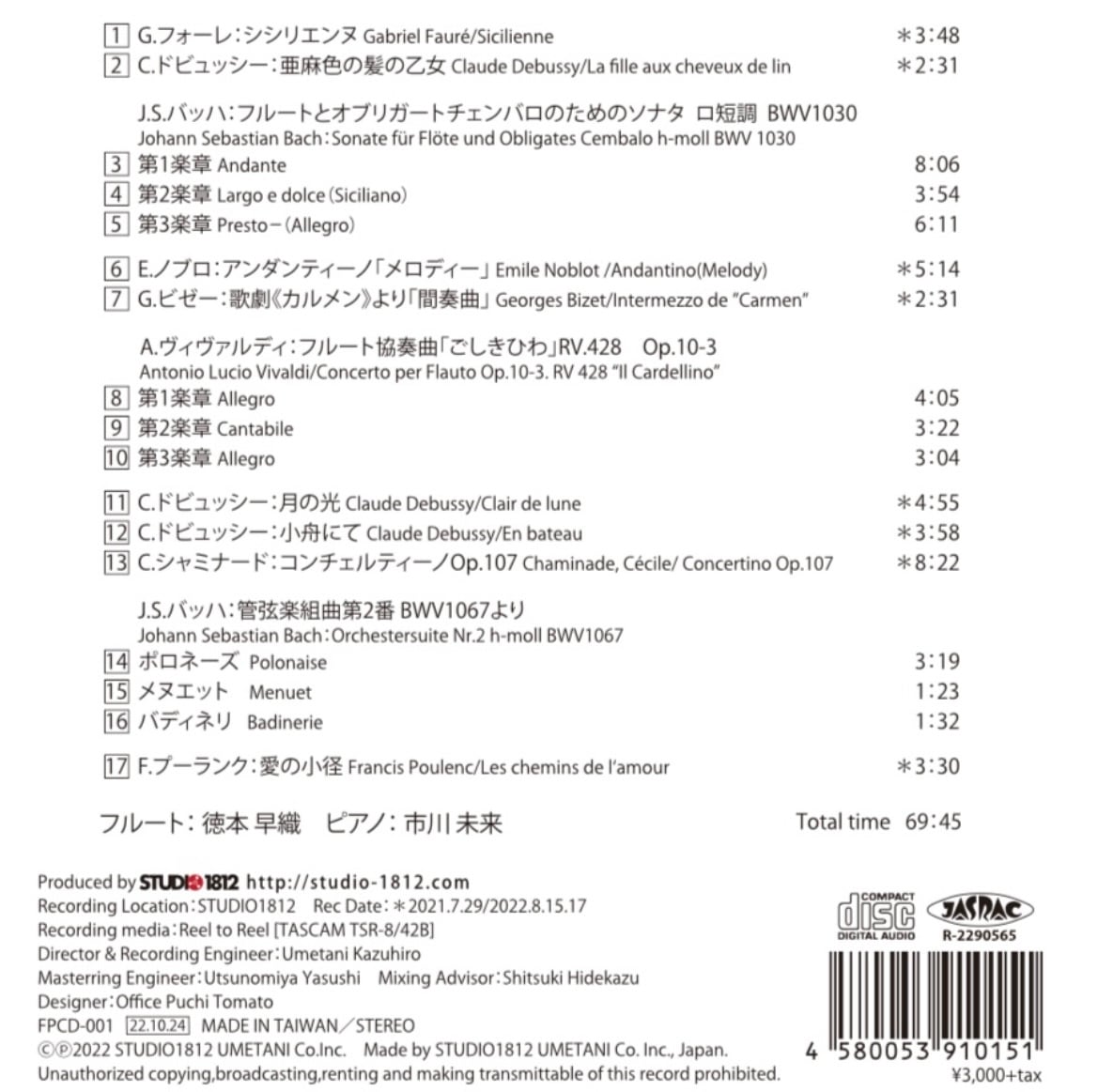 STUDIO1812では最新のDigital録音から旧式のAnalogオープンリール録音まで幅広く対応しており、本作品のメインとなるBach・Vivaldiの録音は初段のMulti録音からAnalogテープ録音を実施しております。